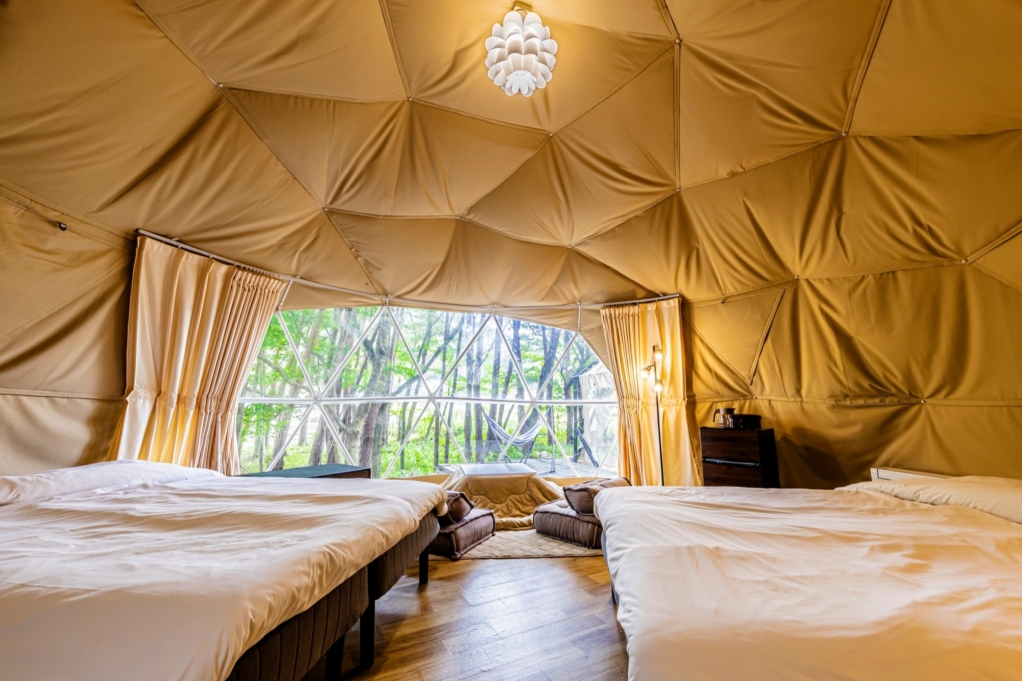 那須塩原市初ドーム型テントを配置した【源泉かけ流し温泉グランピング-グランパーク赤沢温泉-】。