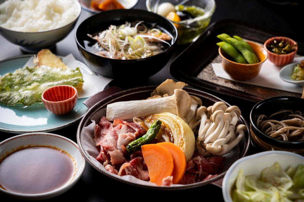 旅館食では安曇野特産のワサビを使用した「ワサビ枝豆」や地元食材を使用した信州サーモンのスモークなど、季節により異なる旅館での会席料理をご用意。